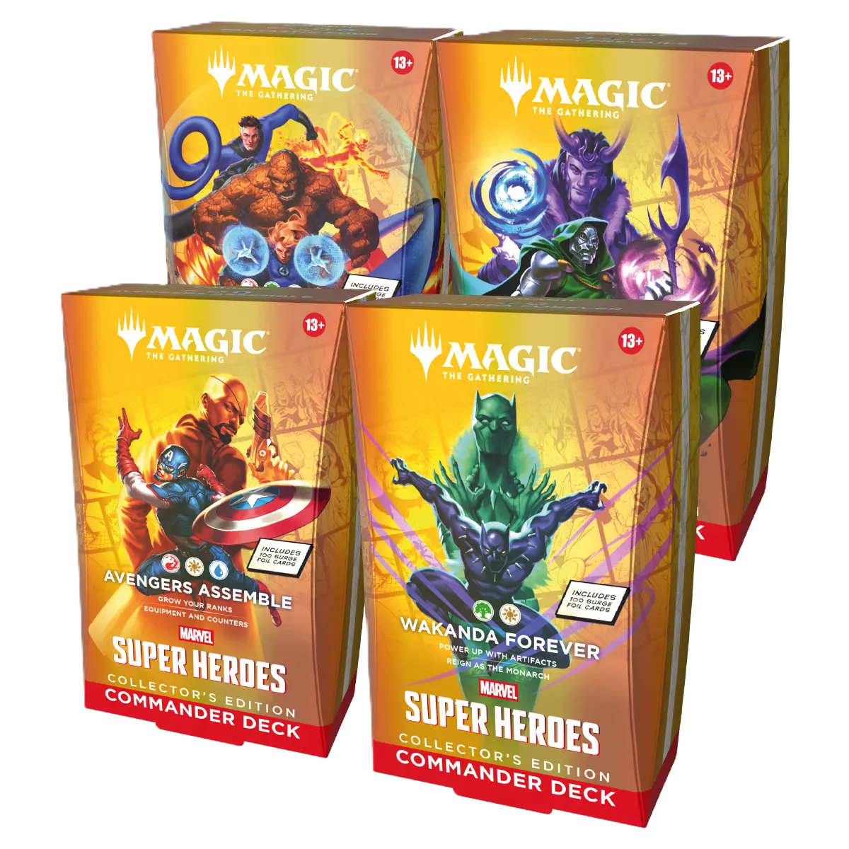 Το Collector Display περιλαμβάνει και τα 4 Marvel Super Heroes Commander decks σε Surge Foil έκδοση (Avengers Assemble, Wakanda Forever, The Fantastic Four, Doom Prevails).
